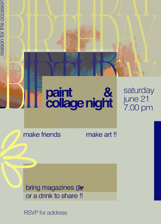 I spent most of my time arranging the pieces to make the first draft. My first draft was simpler, it had less going on. I added more. I used better proximity, I was intentional about where I placed each element. My final design ensured that the viewer could focus on the text that was important in the flyer and that it had a clear purpose. Overall, I am satisfied with the use of an unlikely element in my design and with the end result!